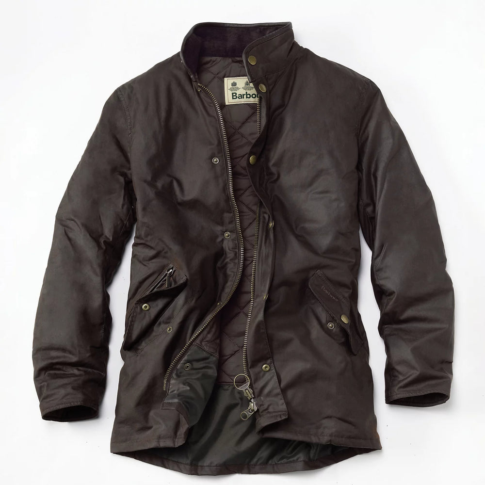 Clean and understated, Barbour's mid-length waxed cotton Prestbury Jacket is essentially a Sylkoil version of the ever-popular Powell jacket. This jacket wears equally well in country settings as it does on city streets.