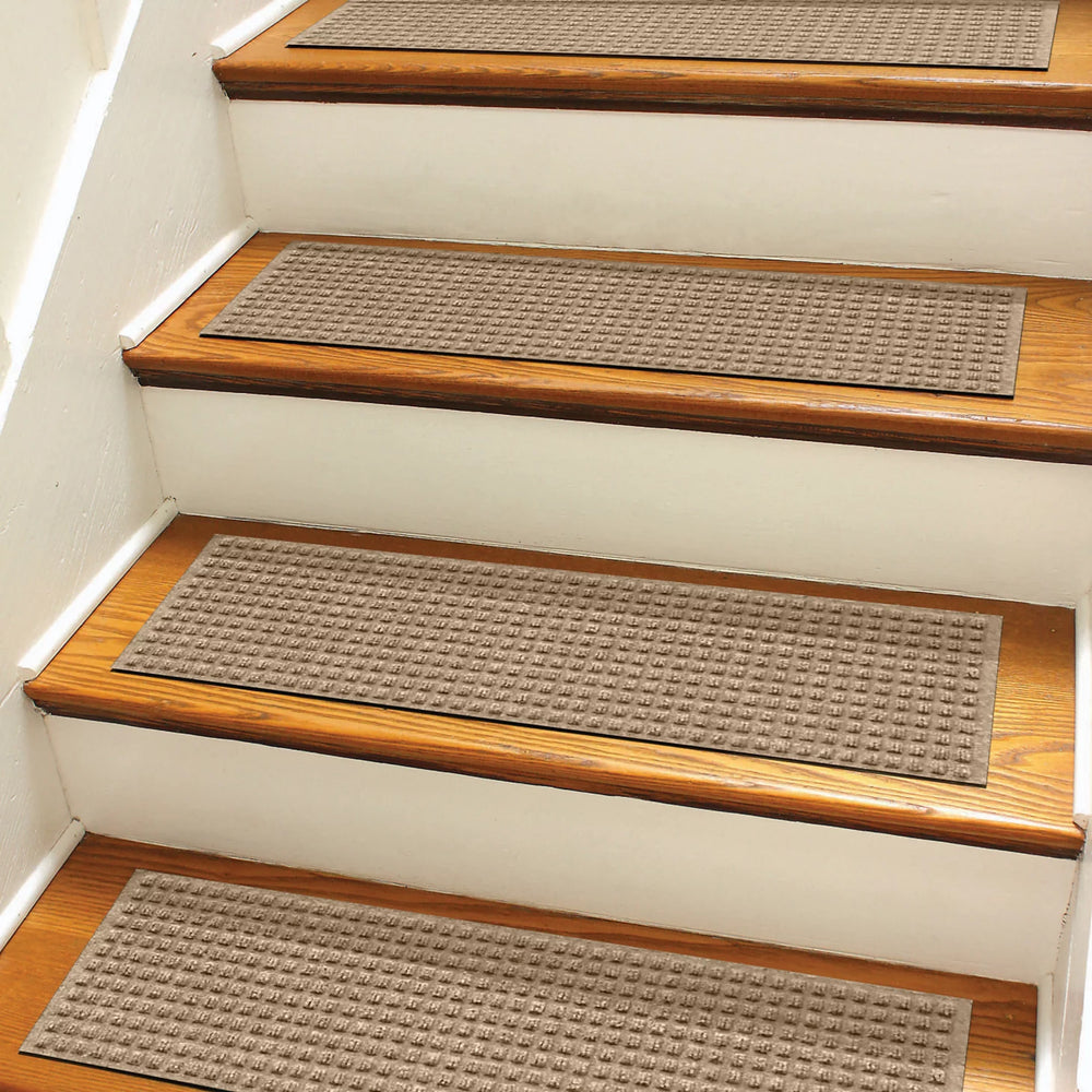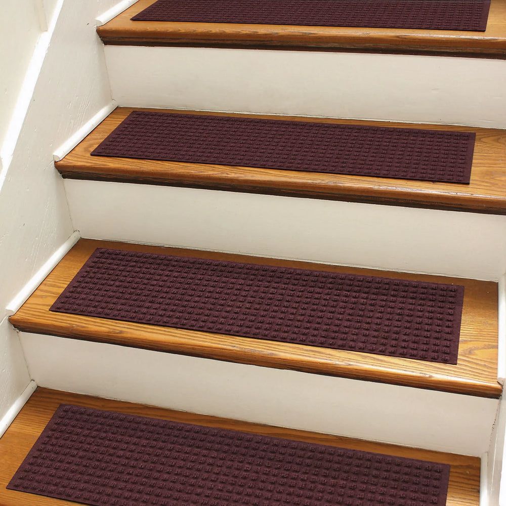 Just like our heavy-duty recycled WaterHog doormats, these stair treads have a tri-denier fiber system that will help collect water, mud, and debris. The thick fibers do the scraping, and the thin fibers do the wipingstopping dirt in its tracks! The unique border allows water to drain from all sides. Stair treads have strong rubber backing for traction on all surfacesgreat for garage, porch, or basement steps. Rug fibers made from PET, post-consumer recycled materialwhich equates to a minimum of five, 16-oz. plastic bottles per square footcreating demand for recycled materials and reducing waste.