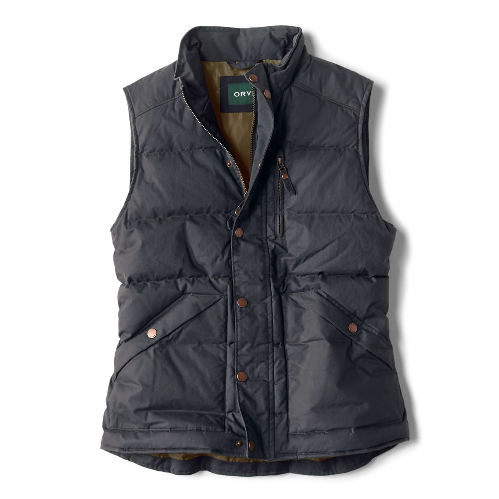 A marvel of technology and design, our weatherproof and warm waxed cotton Down Puffer Vest will be your favorite layering piece. We started with an outer wet waxed cotton fabric from renowned—and innovative—Scottish manufacturer, Halley Stevenson. Resistant to water, wind, abrasion, and punctures, this premium waxed cotton is also eco-friendly. The insulation is 80/20 gray duck down with 650 fill power, giving the horizontally quilted vest a great warmth-to-weight ratio. Two snap-close patch pockets and a vertical zip pocket on the front. The lining features a Teflon water- and oil-repellent finish. Nicely detailed with a pull-tab zipper on front and a vintage-inspired snap-tab on the back to hang your hunting license. Classic Fit.